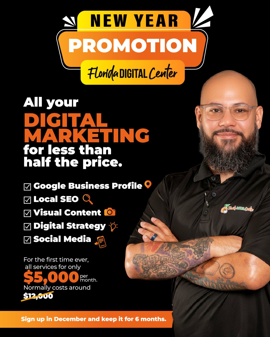 Normally, this level of service costs around $12,000 per month. If you take this offer in December, you lock in the rate of $5,000 per month for the next 6 months.